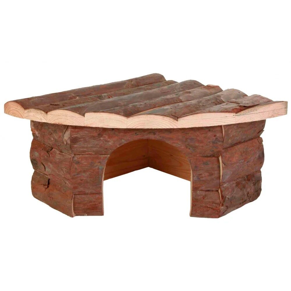“Abrigo em madeira para roedores com zona de descanso no telhado.