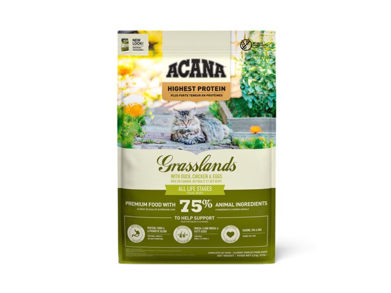 Acana Highest Protein Grasslands para Gatos é uma ração seca premium, formulada com o teor mais elevado de proteína animal dentro da gama Acana. Inspirada na dieta natural dos felinos, oferece ingredientes frescos e diversificados para um desempenho elevado e plena satisfação do seu gato.