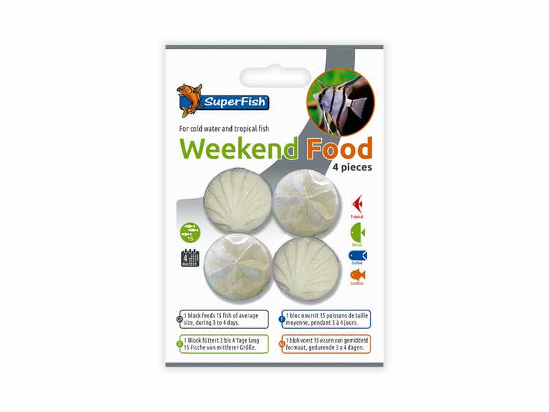 Alimentação durante a ausência: O Alimento Fim de Semana Superfish é especialmente formulado para fornecer alimentação aos peixes durante períodos de ausência, como finais de semana ou viagens. Ele oferece uma solução prática para garantir que seus peixes sejam alimentados adequadamente mesmo quando você não está disponível.