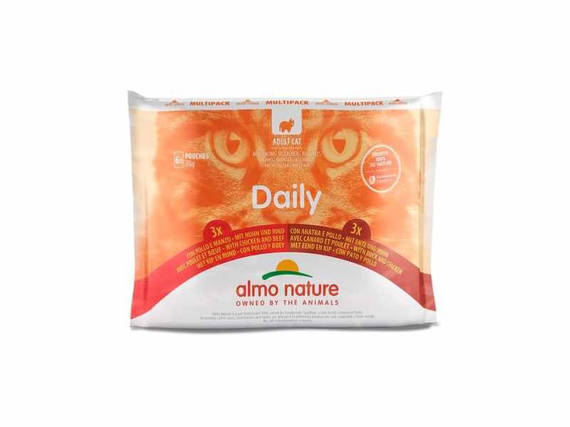 Dê ao seu gato uma alimentação irresistível com o Almo Cat Daily. Escolha entre os deliciosos sabores de Frango com Carne ou Frango com Pato e proporcione ao seu felino uma experiência gourmet todos os dias.