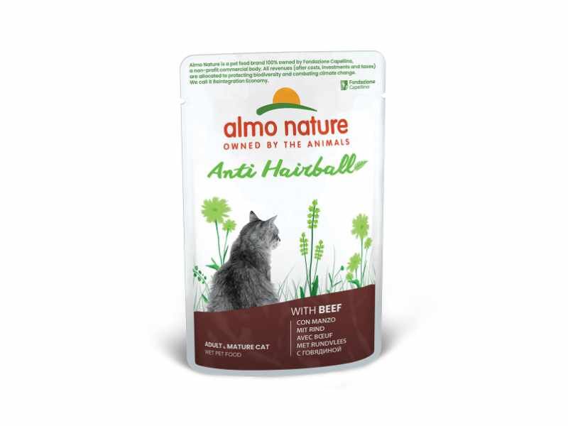 A receita de alimento húmido completo Almo Nature Anti Hairball ajuda a prevenir e a eliminar as bolas de pêlo graças à sua mistura especial de fibras vegetais.