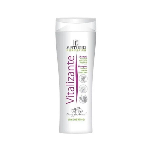 O champô Vitalizante da Artero foi especialmente pensado para o uso em cães de raças de pêlo duro (Schnauzers, Terriers, etc.) ou raças que requerem volume (Caniches, Bobtail). Também pode ser usado em animais com peles sensíveis ou para lavagens frequentes. Hidrata sem deixar uma sensação de peso, proporciona um pêlo limpo, com corpo e volume. Contém um complexo vitamínico que reforça o pêlo e produz um efeito hidratante sobre a pele. A sua fórmula à base de tensioactivos vegetais tornam-no muito suave e além disso possui um PH ligeiramente ácido, o que favorece a saúde da pele. Pode também ser utilizado em gatos.