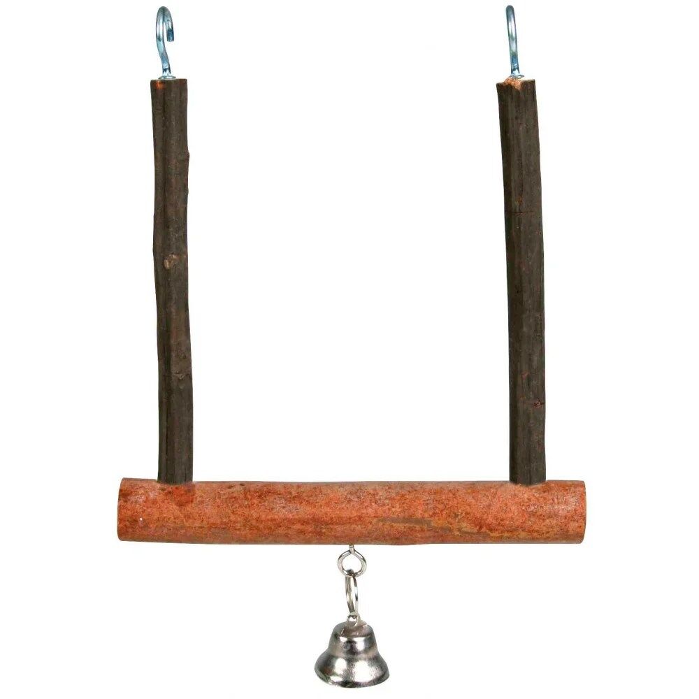 Baloiço de madeira com campainha, 12,5 x 15 cm Natural Living, feito com troquitos de árvore. Este trapézio oscilante de madeira natural é um bom acessório para qualquer gaiola. O sino incentivará o pássaro a brincar com ele e a sentar-se no balanço.