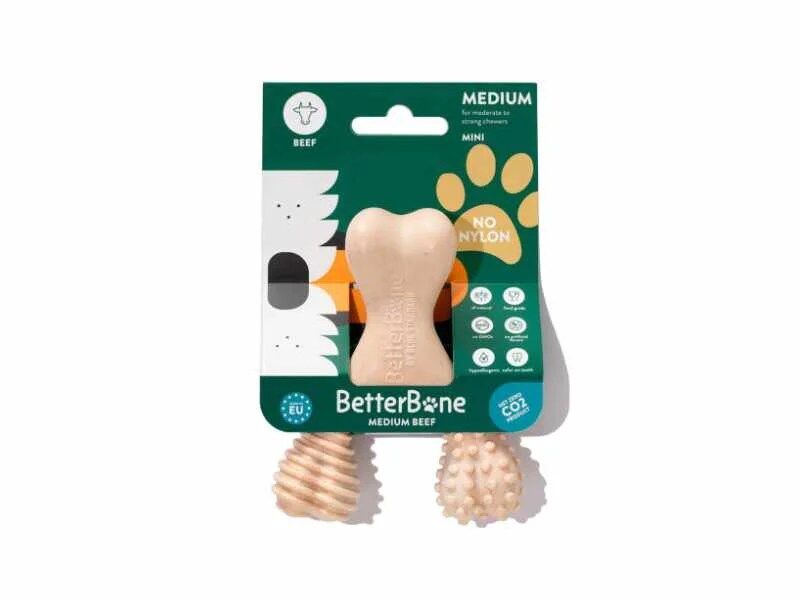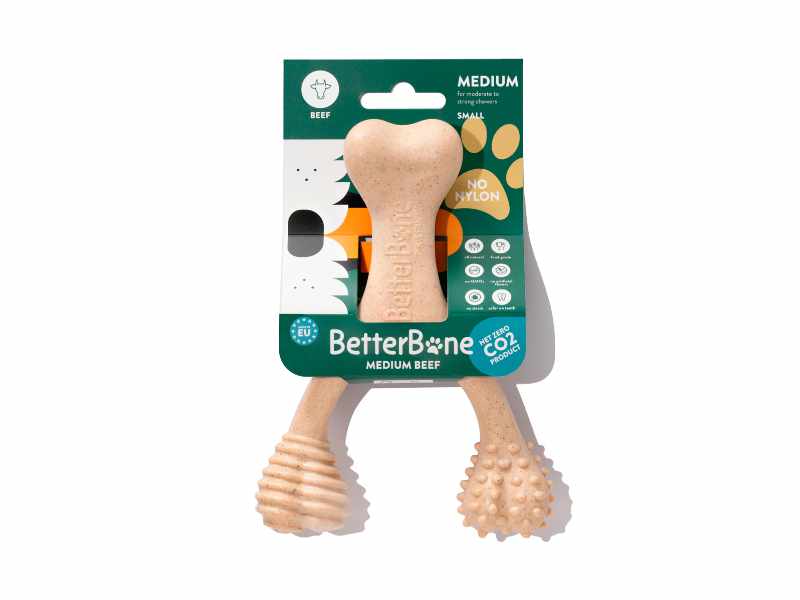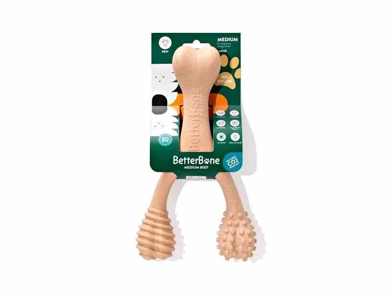 O BetterBone é a escolha perfeita para o seu cão e para o planeta, combinando durabilidade, segurança e sustentabilidade. Desenvolvido com materiais naturais e métodos de produção éticos, este brinquedo de roer oferece uma experiência saudável e segura para cães de todas as idades, especialmente aqueles que adoram mastigar intensamente. Feito a partir de ingredientes não-tóxicos, o BetterBone não só promove a saúde dentária do seu cão, como também ajuda a reduzir o impacto ambiental graças ao seu design neutro em carbono. Se procura um brinquedo que seja bom para o seu cão e amigo do ambiente, o BetterBone é a escolha certa.