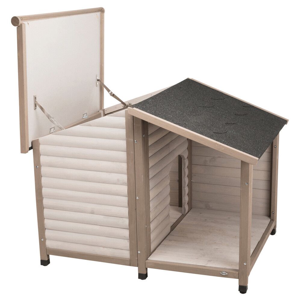 De fácil montagem e com um design moderno e acolhedor, esta casota constitui o abrigo exterior e conforto perfeitos para qualquer cão, quer seja em dias chuvosos de inverno ou em dias mais solarengos de verão. Possui pés extra largos com proteção de plástico que protegem da humidade do solo e permitem a circulação do ar por baixo da casota e conferem uma maior estabilidade, sendo reguláveis em altura. Está ainda equipada com telhado à base de tela asfáltica, e com dobradiças articuladas que permitem a sua abertura de um dos lados para um acesso facilitado ao interior e consequente limpeza mais fácil e eficaz. O seu terraço coberto convida ao relaxamento do animal em qualquer altura do ano.