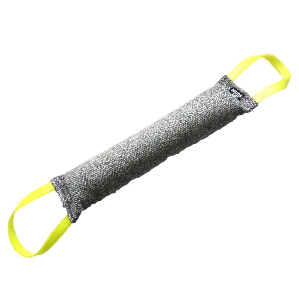 Este churro da Julios-K9 é feito de materiais suaves, não prejudiciais ao cão. Ainda assim, é um brinquedo de treino bastante resistente. Este churro é de algodão e tem duas pegas, uma em cada extremidade, com costura interior.