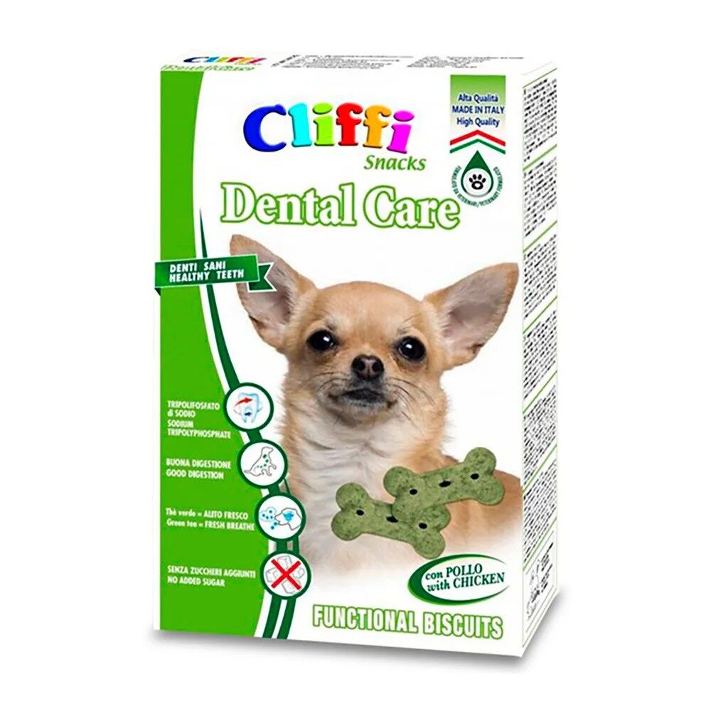 Um snack deve ser apelativo e apetecível, mas também deve ser benéfico para o bem-estar do animal. Os snacks de frango “Dental Care” da Cliffi, para cães de pequeno porte, possuem uma textura estaladiça que proporciona um efeito de limpeza para os dentes. Feito com extrato de green tea e tripolifosfato de sódio, este delicioso snack pode ser dado como recompensa ao animal de estimação, sem quaisquer remorsos, uma vez que beneficia a saúde oral e ajuda a manter um hálito fresco.