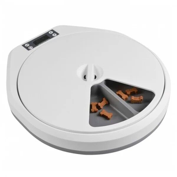 Este comedouro automático da Duvo permite programar a quantidade e o tempo entre cada refeição. Tem 5 compartimentos, 4 dos quais fechados, de 240 ml cada. Basta definir os horários em que quer que o animal coma, podendo definir até 5 horários.