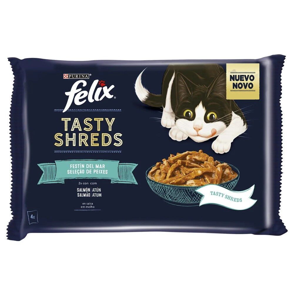 FELIX Tasty Shreds Seleção do campo são tenros e irresistíveis pedaços desfiados num molho saboroso que o seu gato vai adorar! Com um aspeto, aroma e sabor tão deliciosos que parecem mesmo receitas que podiam ter sido cozinhadas por si. Cada receita é cozinhada no ponto antes de os pedaços tenros serem cortados e servidos num molho irresistivelmente saboroso.