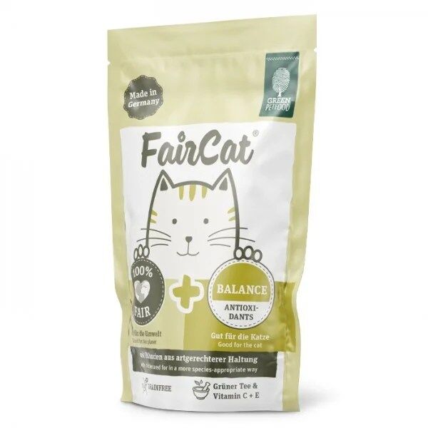 Green Petfood FairCat Balance é um alimento em paté para gatos adultos, formulado sem cereais, que protege os felinos dos radicais livres. Este alimento proporciona saúde e bem-estar ao seu melhor amigo, numa receita formulada com ingredientes de elevada qualidade. Além dos vários benefícios para o seu gato, esta é uma marca amiga do ambiente. O projeto de preservação florestal da Tanzânia da Green Petfood permite-lhes compensar as emissões de CO2 em 125%. Isto significa que, além da compensação das emissões de carbono na totalidade, contribui ainda com 25% extra, reforçando o compromisso na luta por um planeta mais verde. Além disso, a proteína animal incluída nos alimentos provém de animais criados no campo, por produtores locais, com produtos biológicos. BENEFÍCIOSSEM CEREAISCOM ANTIOXIDANTESPRODUÇÃO SUSTENTÁVELDOSE DIÁRIA RECOMENDADA PESO QUANTIDADE < 3 kg< 225 gr3-5 kg225-310 gr5-7 kg310-390 gr> 7 kg> 390 gr COMPOSIÇÃO Frango criado no campo (coração, carne, fígado, pescoço) 70,0% caldo minerais extrato de chá verde 0,10%.CONSTITUINTES ANALÍTICOS Proteína 10,40% Teor de gordura 5,70% Cinza bruta 2,50% Fibra bruta 0,3% Humidade 80% Energia metabolizada 94,70kcal/100 g. ADITIVOS NUTRITIVOS/KG Vitamina E 25 mg Vitamina D3 200 UI Vitamina C 40 mg Zinco (sulfato de zinco, monoidratado) 25 mg Manganês (sulfato de manganês II, monoidratado) 1,40 mg Iodo (iodeto de cálcio, anidro) 0,75 mg Cobre sulfato de cobre II) 1 mg Taurina 1,5 mg.