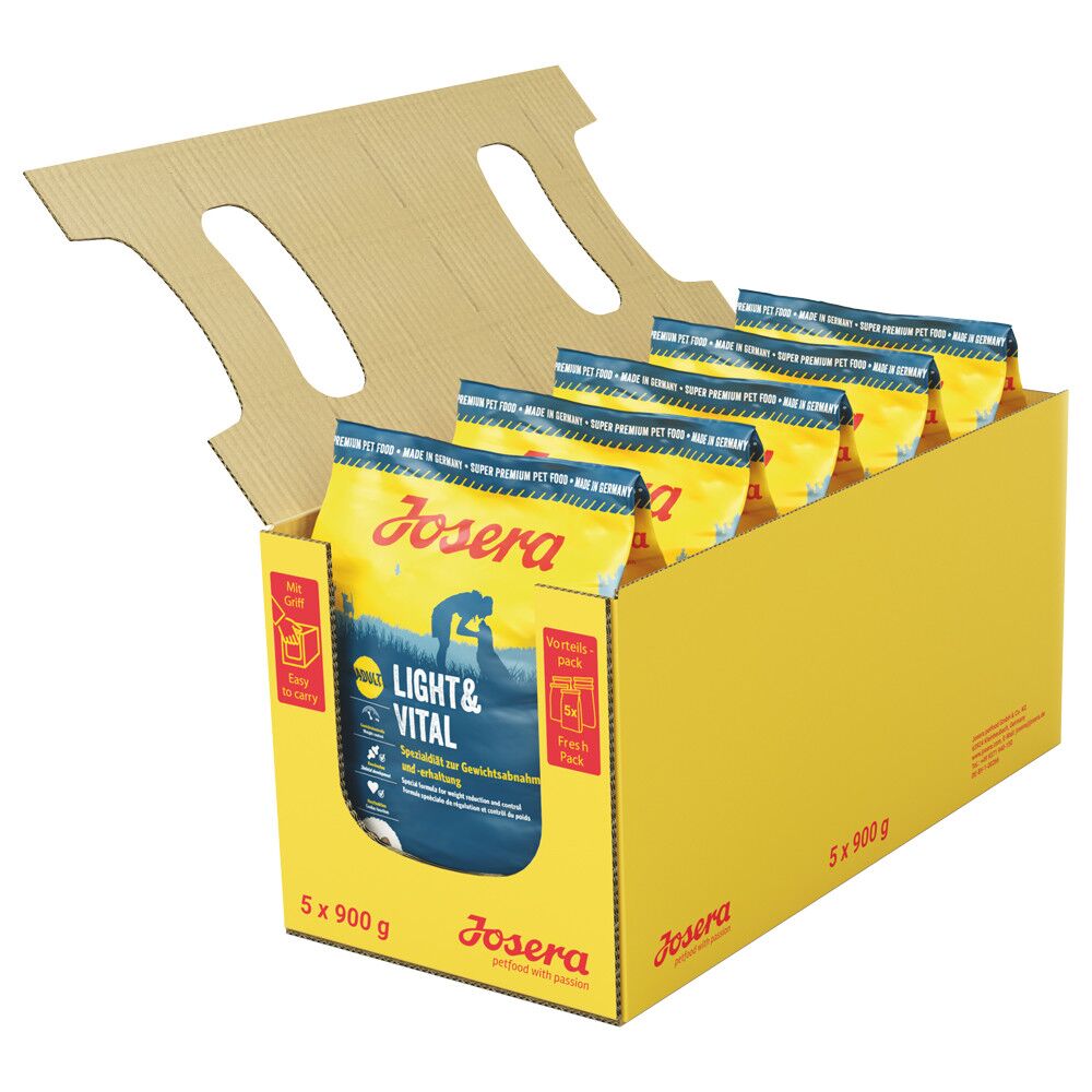 Josera Light & Vital é um alimento seco completo, com baixo teor de gordura e elevado teor de fibras. Uma ração baixa em calorias que satisfaz as necessidades nutricionais dos patudos. Especialmente formulada para cães com tendência a ter excesso de peso, ou que necessitem de o reduzir, contém ainda L-carnitina e taurina, para promover a saúde do coração.