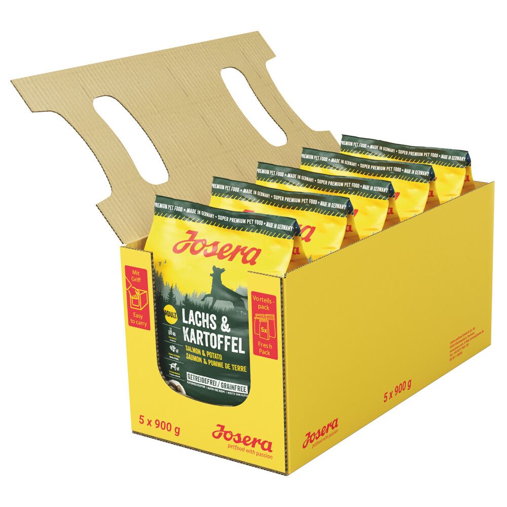 Josera de Salmão e batata é um alimento seco especialmente formulado para cães adultos sensíveis. Uma fórmula sem cereais, com baixo teor de proteínas e energia e teor moderado de minerais, sendo também adequado a cães mais velhos. Com 19% de salmão seco, como única fonte de proteína animal), plantas e frutos. Contém ainda L-carnitina e taurina, para o bom funcionamento do coração.
