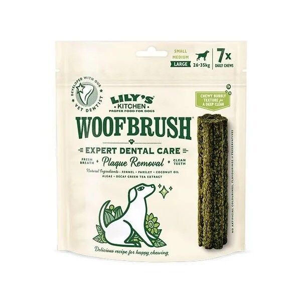 Woofbrush é um snack dentário com uma diferença. Graças à sua textura esponjosa, o Woofbrush alcança a linha da gengiva para ajudar a remover a placa. O seu sabor delicioso torna a limpeza dos dentes numa alegria. Acreditamos que os animais merecem uma alimentação autêntica, o que também é verdade quando falamos de snacks dentários. Porque os cães comem a sua “escova e pasta dos dentes” (o seu snack dentário), é importante que o snack seja tão bom para o estômago como é para os dentes. Woofbrush foi cuidadosamente desenvolvido com a ajuda dos nossos especialistas dentários de animais, para garantir que desempenha a sua função de forma brilhante e utilizamos os melhores ingredientes naturais, como a salsa, o óleo de coco e a erva-doce para uma limpeza adequada. Recomendamos lavar os dentes diariamente, mas se tal não for uma opção então um woofbrush por dia é uma boa alternativa, dado que ajuda a suportar a saúde oral do seu cão.