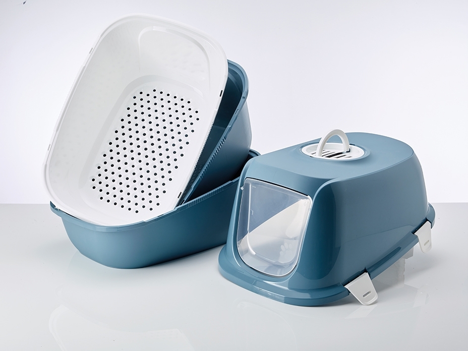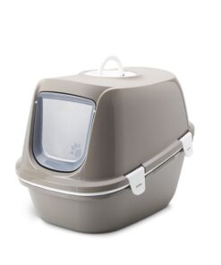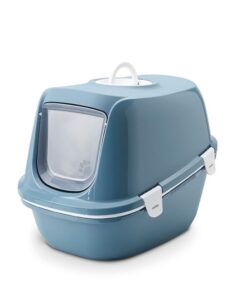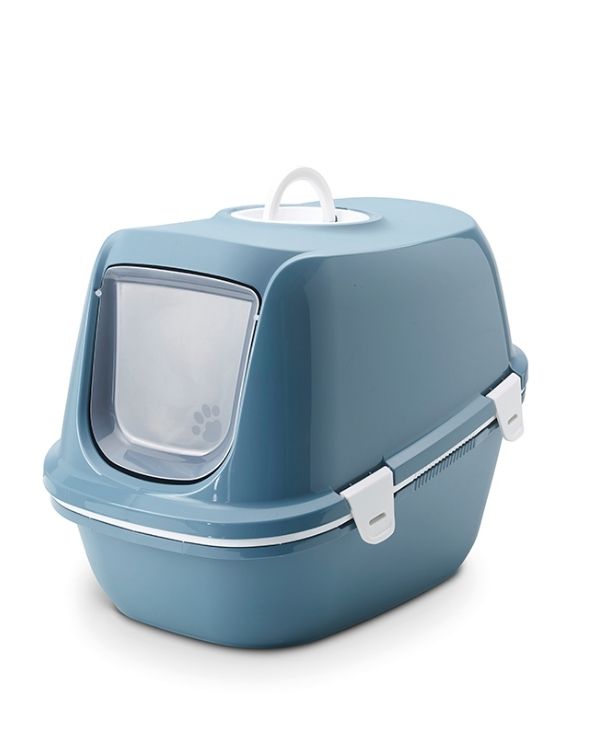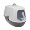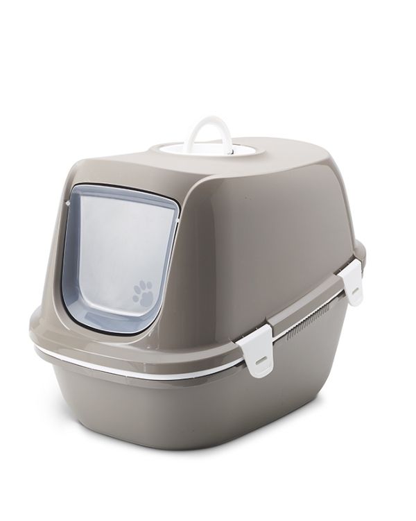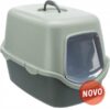 Graças ao seu sistema de dois tabuleiros e peneira. Quando precisar de a limpar, basta remover o tabuleiro superior e encher a peneira com a areia. Todos os dejetos e pedaços de areia aglomerados ficam retidos na peneira, enquanto a areia limpa cai para o tabuleiro para que possa ser novamente utilizada. Este sistema permite uma utilização eficaz da areia. Esta caixa possui ainda uma porta basculante para que o seu gato tenha a máxima privacidade! O filtro de carvão ativo ajuda a neutralizar os maus odores ao mesmo tempo que os mantém dentro da caixa. Dimensões totais: L48 x A46 x C64 cm