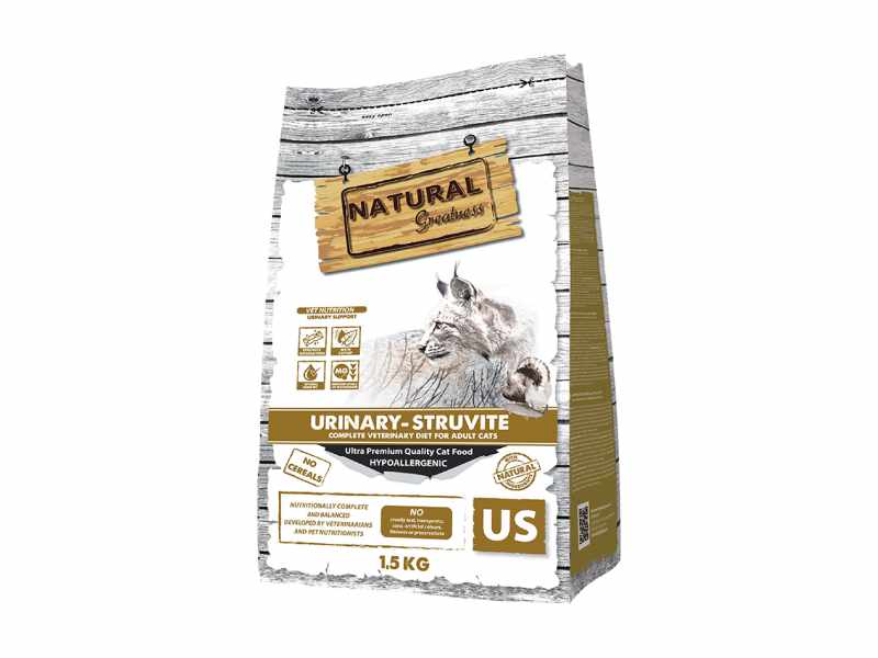 Natural Greatness Urinary – Struvite é uma receita completa hipoalergênica e sem grãos para gatos adultos com urolitíase por estruvita e cistite idiopática felina. Este alimento caracteriza-se pelo seu poder de dissolução e redução do aparecimento de cálculos de estruvita, graças às suas propriedades acidificantes da urina e ao seu baixo teor de magnésio. Urinário – A estruvita também possui um teor reduzido de sódio, potássio e cálcio para apoiar o bom funcionamento do sistema urinário. Além disso, sua fórmula antiestresse com catnip e proteína hidrolisada do leite causa um efeito positivo no sistema nervoso e circulatório do gato.