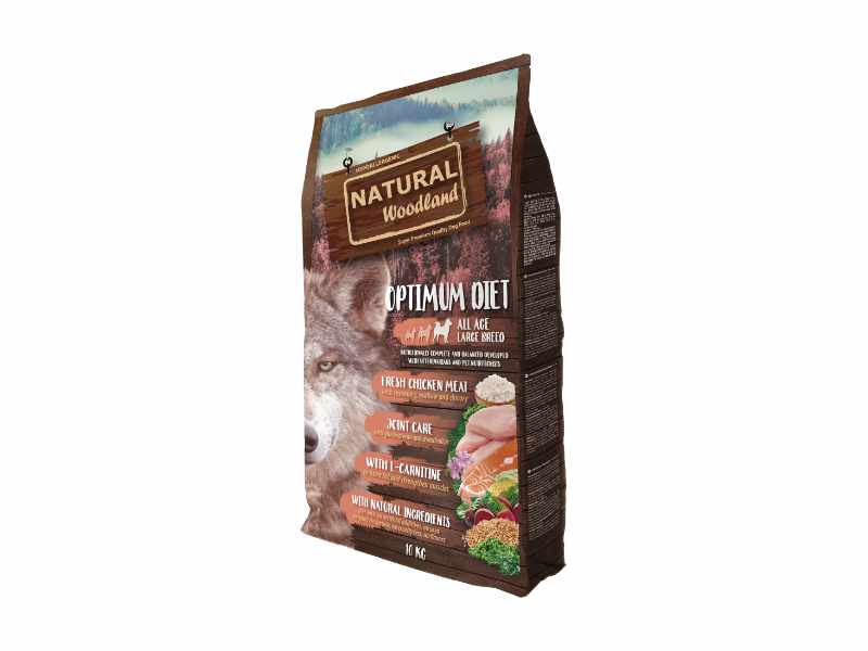 Natural Woodland Optimum Large Breed, um alimento seco formulado para atender às necessidades específicas de cães de raças grandes. Com ingredientes selecionados, esta fórmula oferece uma nutrição completa e adaptada ao porte desses cães, promovendo saúde e vitalidade.
