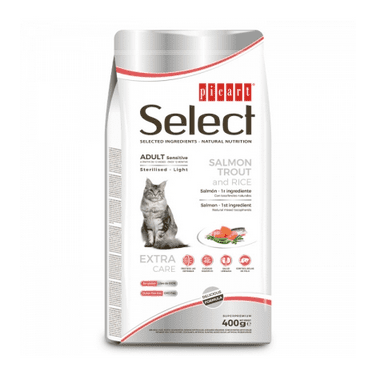 Picat Select Adult Sensitive Sterilised/Light é um alimento completo e equilibrado, adequado a gatos adultos com sensibilidades, esterilizados ou com excesso de peso. Esta ração não contém glúten nem Organismos Geneticamente Modificados (OGM).