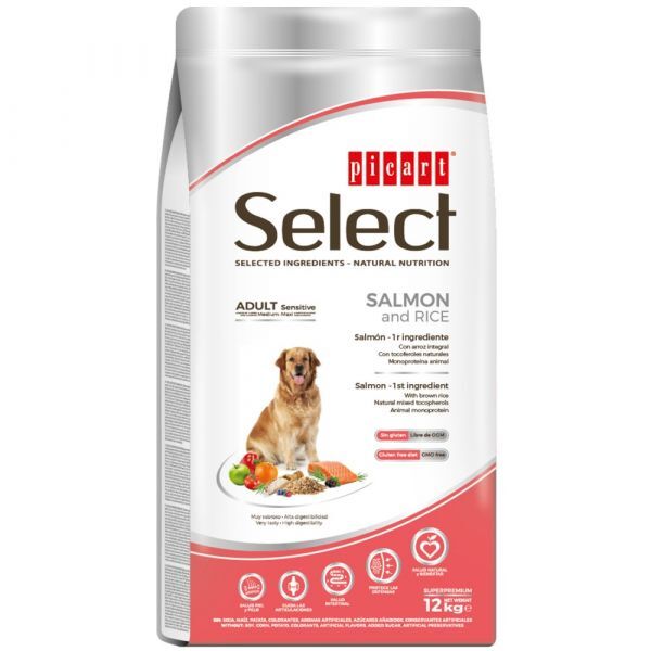 SELECT SUPERPREMIUM SENSITIVESelect SuperPremium Sensitive é um alimento seco de salmão e arroz, para cães de qualquer raça, com intolerâncias alimentares. Uma ração de ótimo sabor, com 26% de salmão, sem glúten de trigo e com um complexo antioxidante fisiológico natural.Este alimento favorece uma boa saúde geral ao seu patudo, sendo de ótimo sabor e elevada digestibilidade.COMPOSIÇÃOSalmão desidratado (min. 26%); Arroz (min. 25%); Milho; Gorduras animais; Polpa de beterraba; Peixe desidratado; Levedura de cerveja; Hidrolisado de proteína de peixe; Polpa de tomate; Minerais; Óleo de peixe; Pimentão; Prebióticos MOS; Extrato cítrico; Extrato de Mandioca; Alho.COMPONENTES ANALÍTICOSProteína 26%; Conteúdo de gordura 15%; Matéria inorgânica 7,7%; Fibras brutas 2%; DHA 4.800mg/kg.