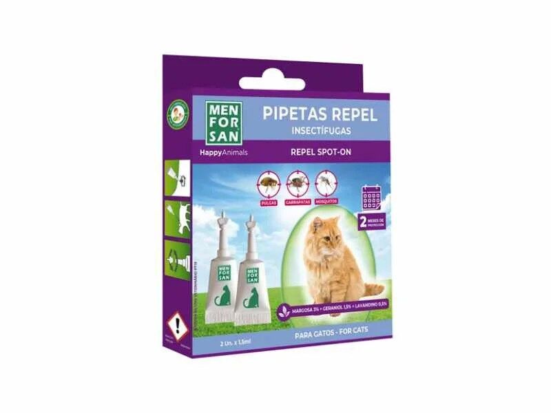 Pipetas antiparasitárias para gatos, contra infestações de pulgas, carraças, piolhos, ácaros e picadas de mosquito. Cada pipeta contém 1,5 ml de produto.