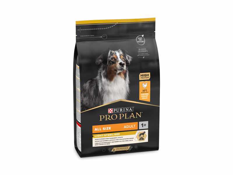 Essa ração seca foi especialmente formulada para cães adultos que precisam de controlo de peso ou foram esterilizados