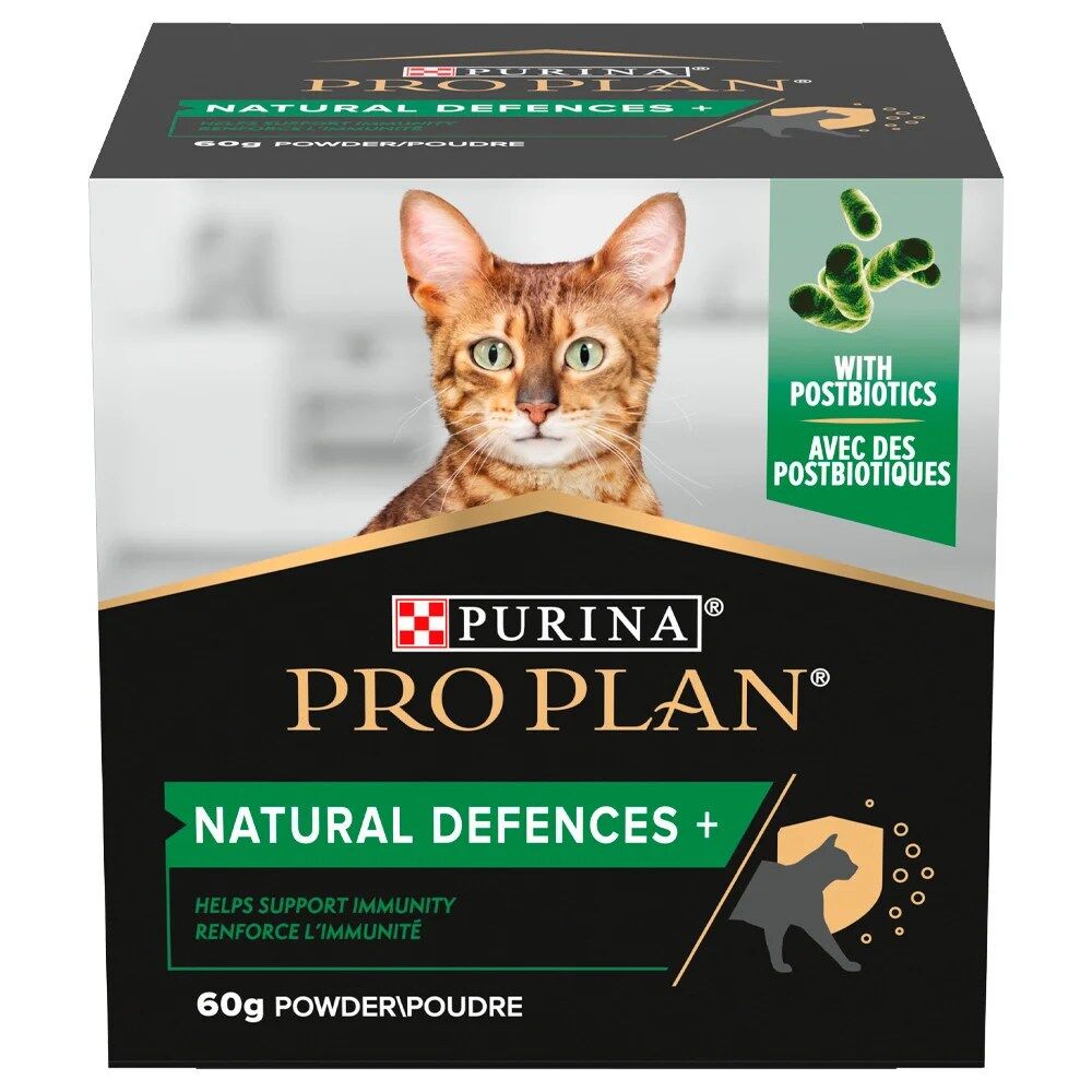 PRO PLAN Natural Defences+ é um suplemento que protege o seu gato desde o interior, graças aos pós-bióticos. Está cientificamente formulado para suportar o sistema imunitário e ajuda na produção natural de anticorpos.