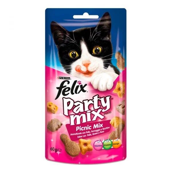 | Benefícios | Com sabor a Frango, Queijo e Peru – Partilhe mais momentos adoráveis e divertidos com o seu gato com o novo Felix Party Mix – contém uma irresistível e colorida mistura de saborosos snacks, repletos de aromas tentadores, sabores deliciosos e texturas apetitosas. |