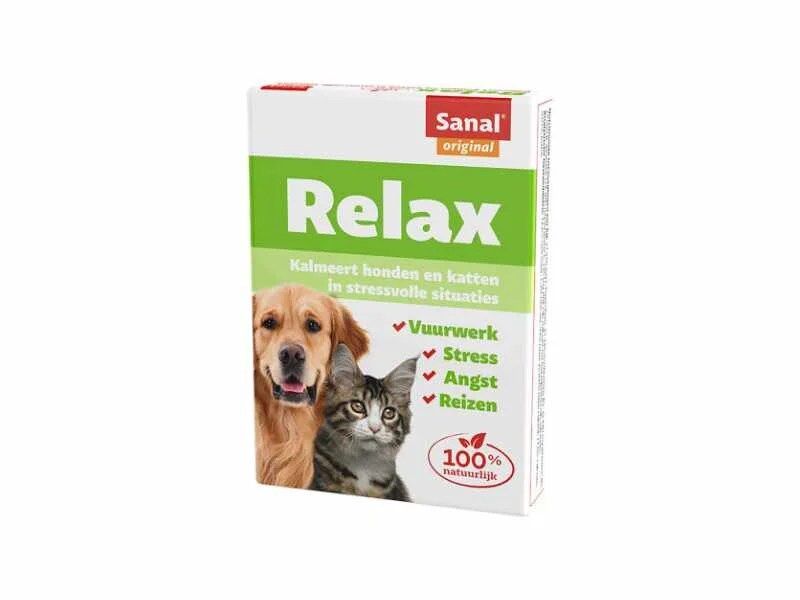 “Sanal Relax” são comprimidos 100% naturais, que ajudam a acalmar o animal em situações de stress e ansiedade (fogos de artifício, tempestades, etc.), ou então em situações de enjoo. O seu princípio ativo L-Triptofano (aminoácido) funciona como um calmante natural, sem deixar o cão ou gato sonolentos. Além disso, “Sanal Relax” ajuda a prevenir a hiperatividade e latidos excessivos nos cães.