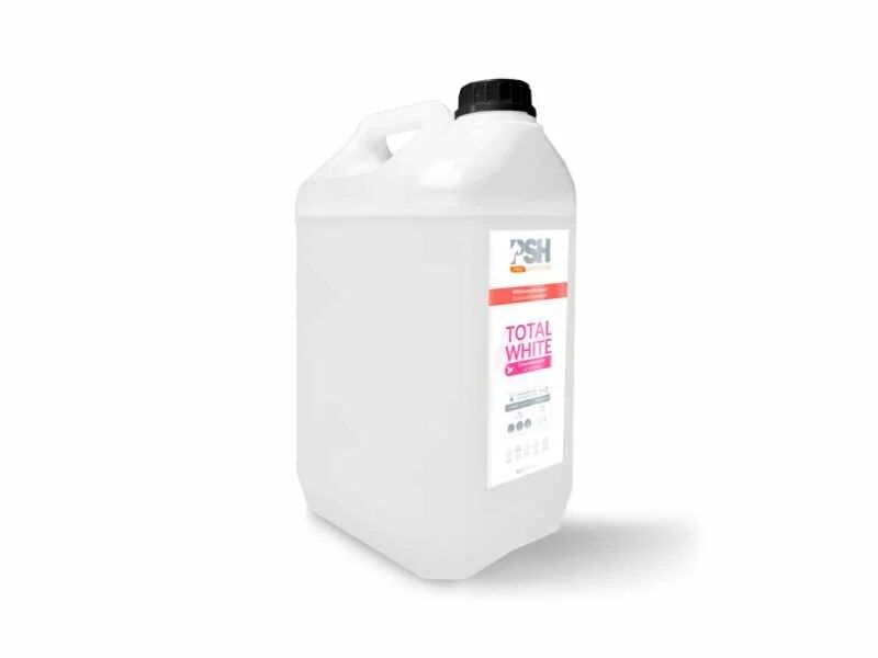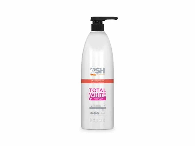 O champô PSH Total White corresponde ao passo 2, o banho específico, em que o objetivo é obter o melhor resultado, de acordo com a raça, o tipo de pêlo e as necessidades específicas de cada animal. Este champô é formulado para conseguir um tom uniforme nas pelagens brancas. A incorporação de óxido de titânio confere luminosidade ao pelo. Para melhorar o resultado, recomenda-se a utilização frequente, não deixando o pelo seco.