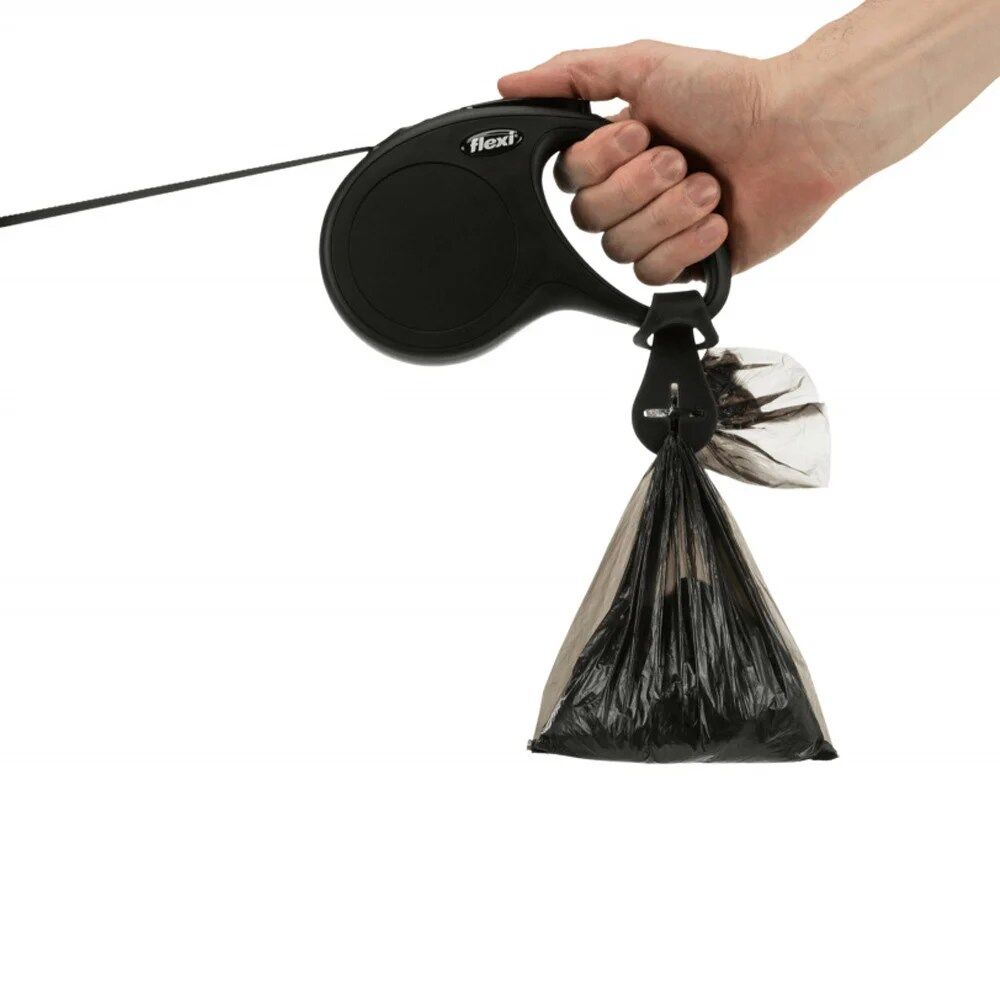 Feito de silicone. Para sacos de dejetos novos e usados. Fácil de fixar à trela ou à pega da trela extensível. Remoção rápida do saco sem necessitar de desfazer o nó.