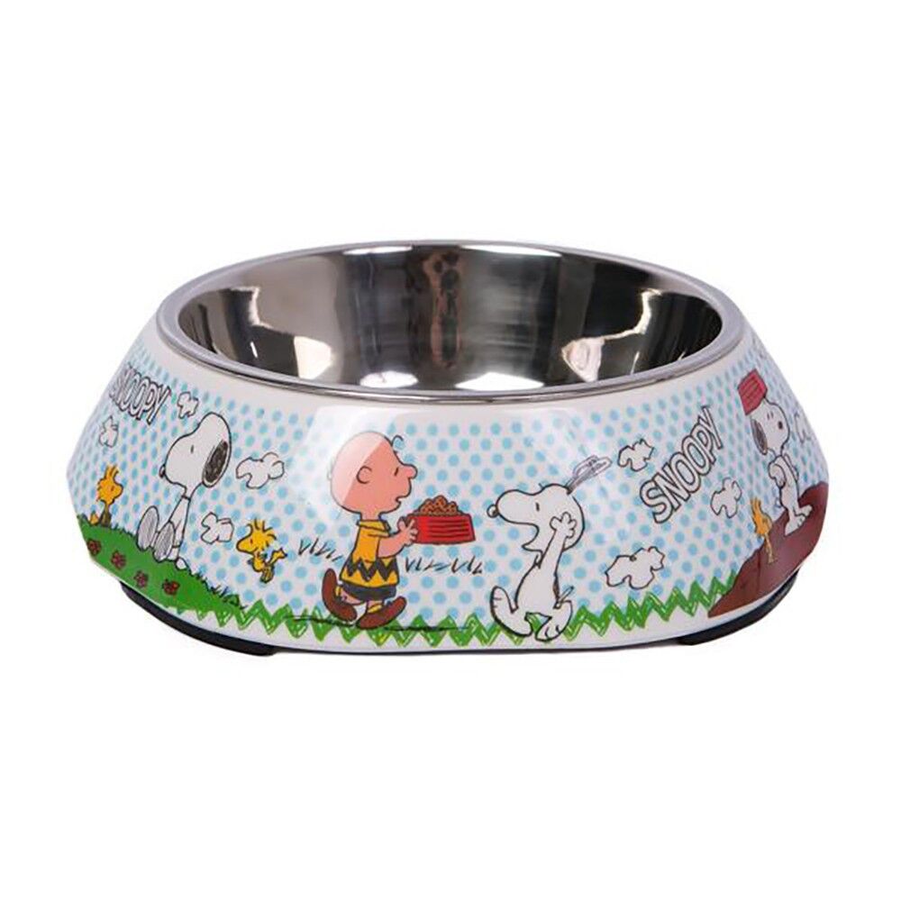 Taça dupla em melamina e inox Charlie Brown Oficial Snoopy de qualidade superior, pois é feita de material não tóxico, antiderrapante e muito fácil de higienizar, podendo ser colocada na máquina de lavar loiça.