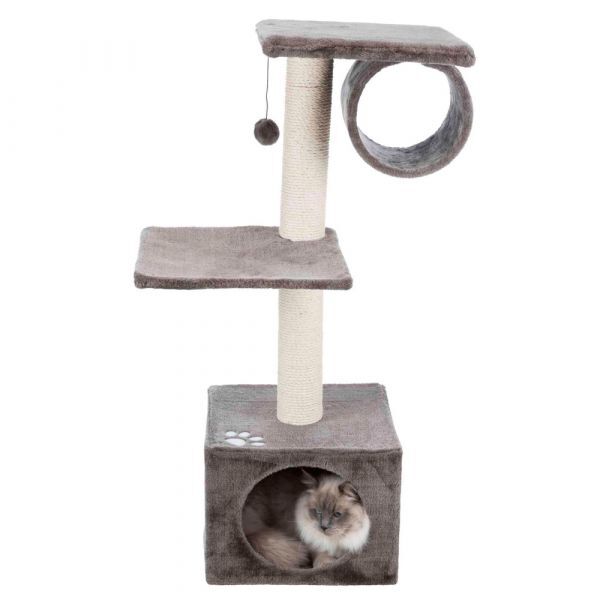 É forrado em pelúcia (poliéster) e possui um poste envolto em sisal natural para que o animal afie as suas unhas. Conta com uma plataforma acolchoada no topo, com um cilindro, com um confortável hammock e com um acolhedor e espaçoso nicho forrado em pelúcia, o refúgio perfeito para qualquer gato. Para não faltar interesse e curiosidade, possui ainda um brinquedo suspenso em corda. Este produto será certamente muito apreciado pelo seu animal, permitindo serões em pleno.