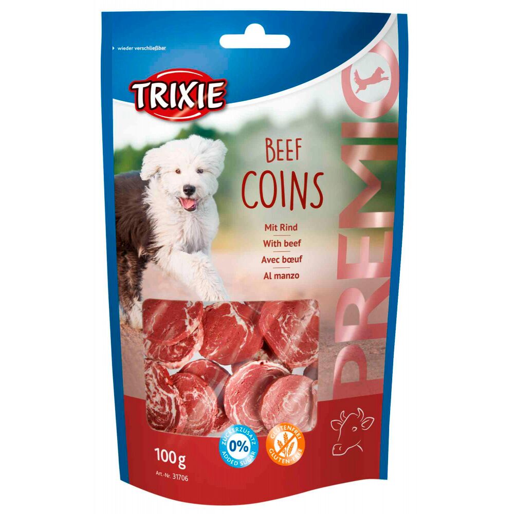 Os snacks Trixie Premio Beef Coins são ideais para dar ao animal entre as refeições. Estes snacks não contêm glúten, pelo que ajudam a reduzir as sensibilidades alimentares do animal. A receita sem açúcares adicionados, para além de ser benéfica para a saúde do cão, ajuda a controlar o seu peso. A embalagem com fecho zip mantém as propriedades do alimento por mais tempo, ajudando a conservar a sua frescura.