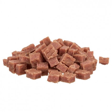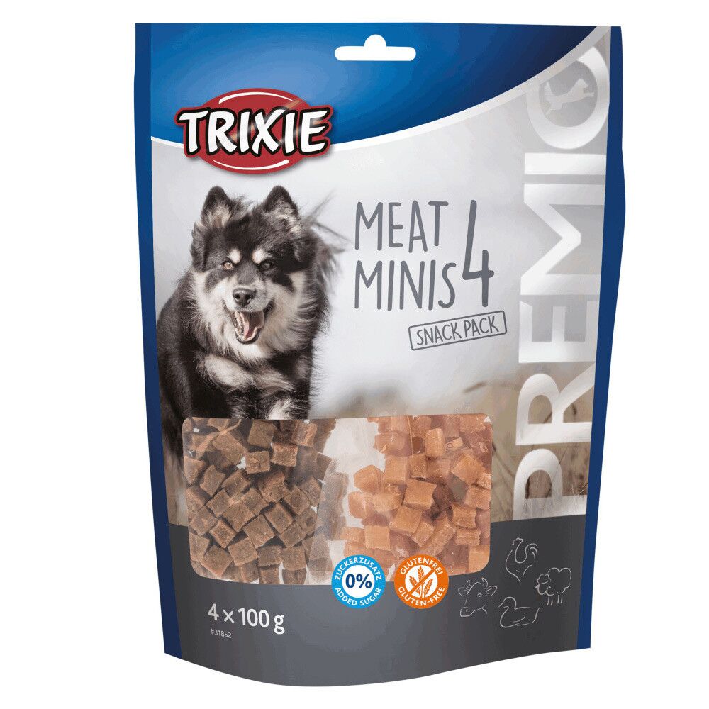 Os snacks Trixie Premio 4 Meat Minis são ideais para dar ao animal entre as refeições, proporcionando-lhe uma grande variedade de sabores numa mesma embalagem: galinha, pato, vaca e cordeiro. Estes snacks possuem um alto teor de carne (89%), sendo ricos em proteínas. Não contêm glúten, pelo que ajudam a reduzir as sensibilidades alimentares do animal. A receita sem açúcares adicionados, para além de ser benéfica para a saúde do cão, ajuda a controlar o seu peso.