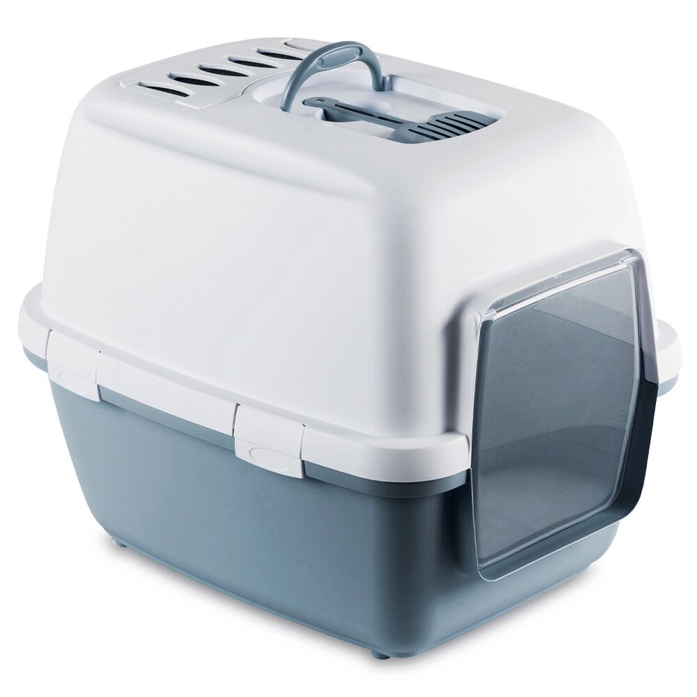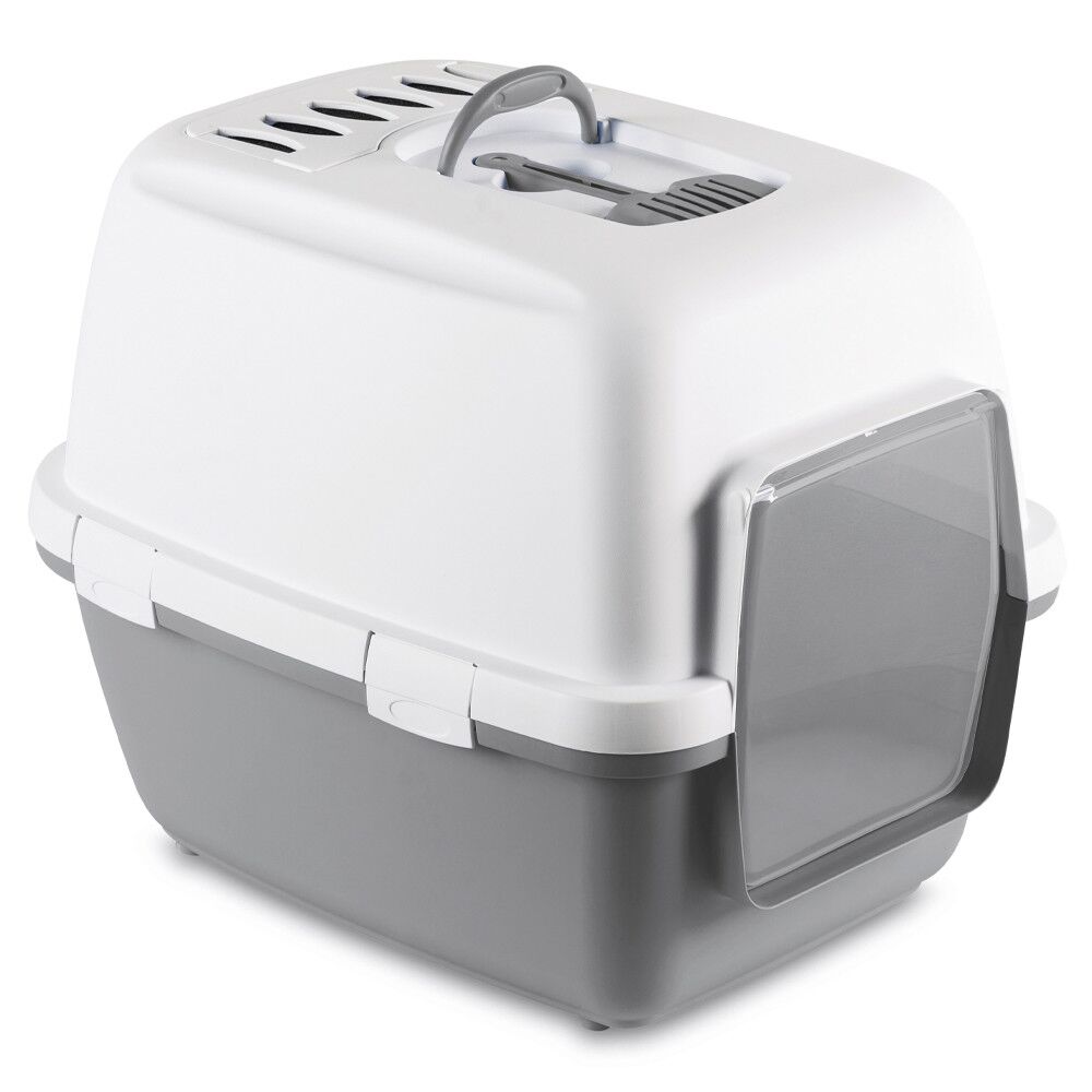 WC para gatos, com porta basculante transparente. Confortável para os felinos. Inclui filtro para redução de odores e pega para fácil transporte.
