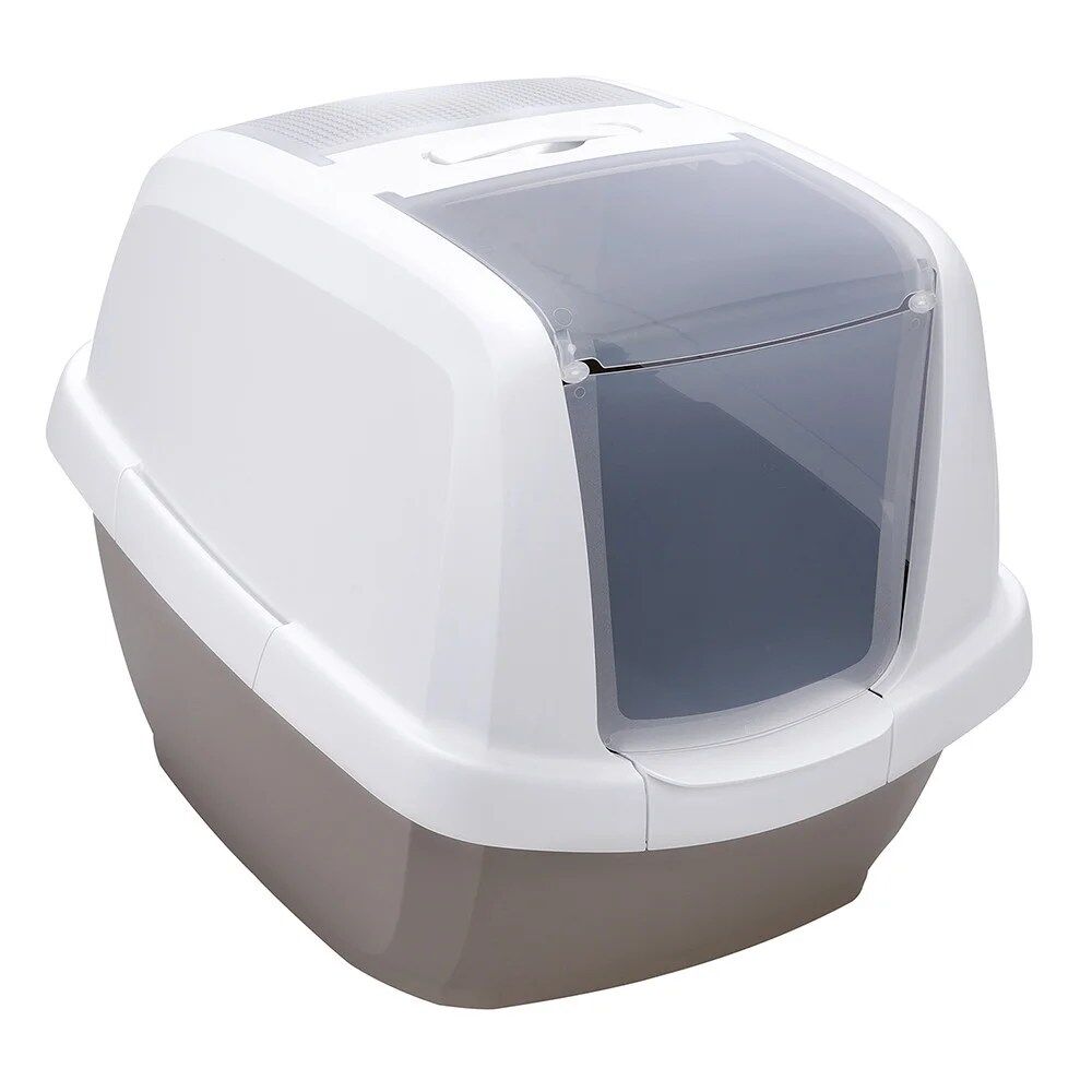 Com filtro de carvão ativo incluído. Possui uma plataforma de suporte para ajudar o gato a entrar e a sair. A porta dobrável levanta para limpeza rápida e fácil. Também indicada para gatos grandes.